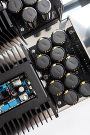 The internal ground reference has been vastly over dimensioned and kept fully free of rectifying and output currents. The result is a very clean, noise free output signal regardless of output power, providing a very stable sound stage with the blackest background possible at any sound level.